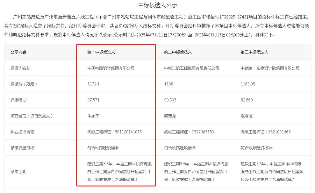 广州局集团有限公司广州工程建设指挥部于2025年7月11日在广州公共资源交易中心公示了广州东站改造及广州东至新塘五六线工程(不含广州东站站房工程及同体市政配套工程)施工图审核招标中标候选人公示,公示显示共有3家投标人递交了投标文件,第一中标候选人为中国铁路设计集团有限公司,投标价为1172.1万元,承诺工期为自合同签订日起至项目竣工验收完成(含清概结算)。广州东站改造及广州东至新塘五六线工程施工图审核中标候选人公示如下:
